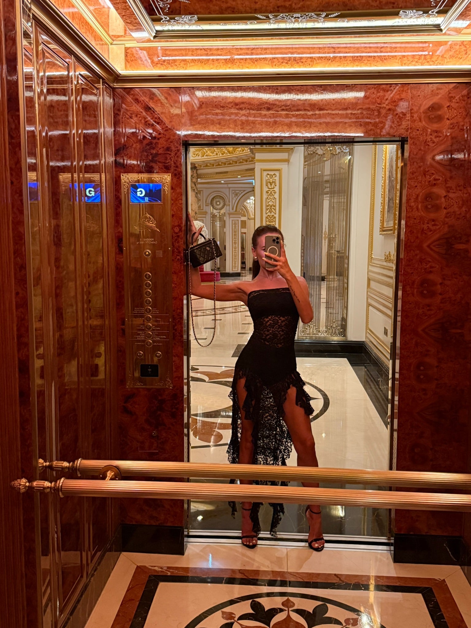 is the embodiment of bold elegance and sensuality. Crafted from exquisite black lace, this dress embraces your silhouette with irresistible charm. The daring high slits reveal just enough, while cascading ruffles bring drama and graceful movement with every step.