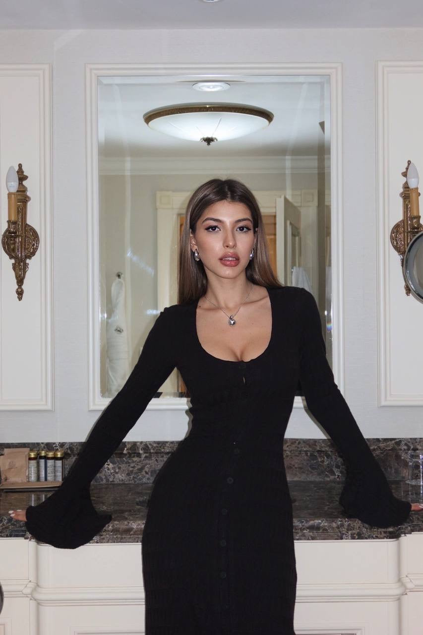 The dress fastens with buttons along the entire length, which makes it possible to adjust the depth of the cut, making the model both discreet and more seductive