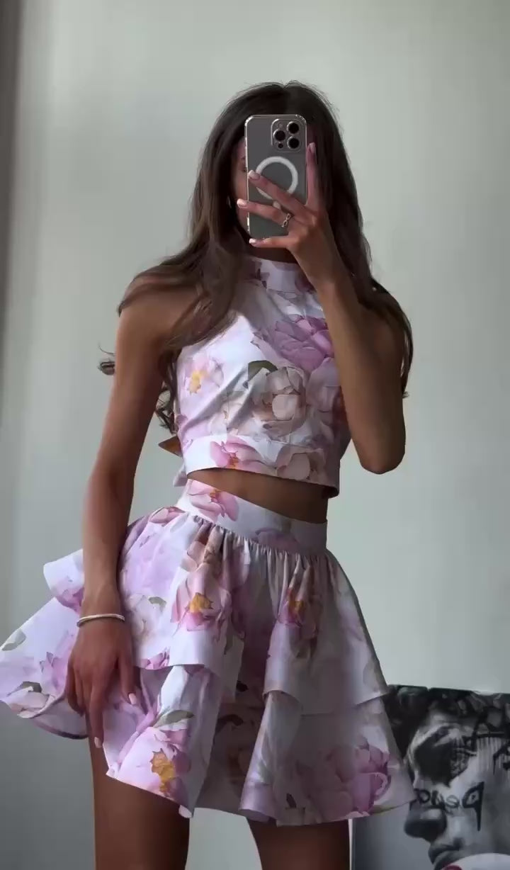 The American top and the emphasis on the waist harmoniously combine with a voluminous multilayered skirt